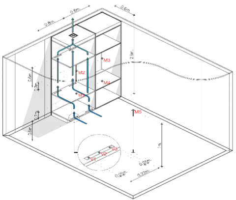 The new design concept of VBC is that it should allow air to enter at the lower part, circulate inside through various compartments and exit at the top. To conduct our investigation, we used a commercial particleboard and modified it according to our objective. Such, a small prototype of VBC of 1.248 m3 volume was built with a small DC fan (SANYO DENKI 24V, 0.16A) located at the top. Figure 2 shows a schematic and dimensions (left) and photograph (right) of the vented built-in closet. For ventilating the VBC, we consider two small rectangular openings (1.5 cm × 22 cm) at the lower part under the front for air inlet, and at the deep part of the two inner shelves as seen in Figure 2. Air enters at the bottom, flows through, and exits at the top (for dimensions refer to Figure 2). To assess the VBC performance, a standard built-in closet (non-ventilated) of the same volume was assembled and installed attached to the VBC. The panel separating the VBC and BC was well insulated using insulation foam and sealed using adhesive tape. The experimental setup was located inside an empty bedroom 4.0 m width, 5.0 m length, and 2.6 m height (52 m3 Volume) of a residential house located in Bangkok.