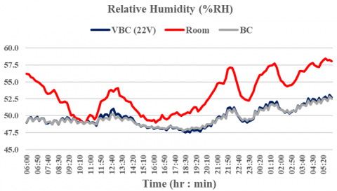 Under test conditions considered and despite the fact tests were conducted on several days with varying ambient conditions, it is observed that measured data showed the temperature inside the VBC is always lower than that of the standard BC. Obviously higher temperatures differences are observed during daytime due to high room temperature. The relative humidity difference is less noticeable due to the small difference of temperatures between measured data. Increasing the ventilation rate did not lead to any significant performance improvement as the measured temperatures differences decreased. Therefore, a ventilation rate equal to that required for bedroom ventilation is appropriate and can be adopted by architects and interior designer as a general rule for designing VBC.