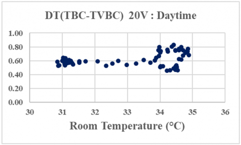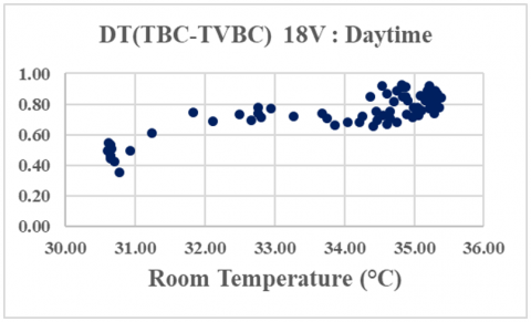To make subjective comparative analysis, ensure accuracy and reproductivity of the performance of the VBC with field tests conducted under different days and variable ambient conditions, we define the ventilation efficiency of the VBC as the calculated temperature difference between non-ventilated and ventilated built-in closet (DT(TBC-TVBC)) plotted versus room temperature. Figure 5 shows the scatter of the efficiency of the VBC for the different ventilation rates considered during daytime (top) and nighttime (bottom).