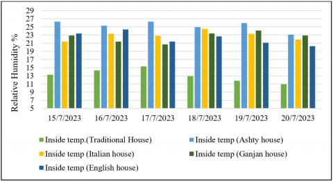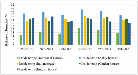 In a similar vein, for the month of July, the relative humidity within modern houses was higher than the interior of traditional houses for the given outdoor and indoor temperatures. The relative humidity of inside spaces rose to 7%, making them significantly hotter than necessary.