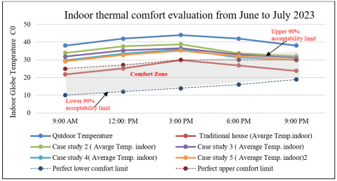 As illustrated in Figure 12, It was found that the interior temperature of conventional homes falls within the comfort zone when compared to ASHRAE guidelines. A modern building's main room typically reaches a maximum air temperature of 37.4℃ and a low air temperature of 28.1℃. The indoor temperature was found to be outside of the comfort zone when compared to the ASHRAE norms. According to Figure 9, the inside air temperature of a typical building is maintained at 21.2℃ and 26.3℃ throughout the summer with a relative humidity of 9% to 11%, which is within the ASHRAE-recommended comfort zone. Modern houses (Figure 9) maintain an indoor temperature between 28℃ to 37℃ with a relative humidity of 12% to 16%. In accordance with ASHRAE regulations, this occurs when the outside temperature fluctuates between 19℃ and 30℃, which is outside of the comfortable range. Therefore, in the absence of a fan or air conditioning, the exterior of an older structure stays more pleasant for a longer period than the newer building. The presence of windows, wind catchers, and courtyards in traditional buildings shields the interior living area from direct solar radiation, which is likely the cause of its increased cross-ventilation rate phenomenon. The measurement's outcome indicates that the traditional home is pleasant between the hours of 9:00 a.m. and 12:00 p.m. and between 12:00 p.m. and 9:00 p.m., and its temperature falls within that range. New buildings provide comfortable indoor temperatures between the hours of 8:00 p.m. and 6:00 a.m. (19℃ to 30℃), thus, it is thermally unfriendly in modern structures after 6:00 a.m. Relative humidity and temperatures of the traditional and modern homes were recorded throughout the months of June and July. In the assessment of interior temperature comfort in June and July 2023, the allowed limit for interior air temperatures between 19℃ and 30℃ is comfortable. Therefore, modern residences fulfilled the dreaded 90% requirement. Even though the data from the traditional house suggests that these residences conform with the 90% acceptance band of the adaptive comfort standard model, this research will demonstrate that the temperatures in these homes are typically outside of the comfort range.