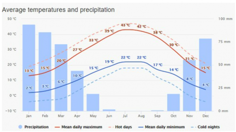 Erbil experiences hot, dry summers from June to September. Daytime highs typically range from 95° to 113℉, with occasional heatwaves pushing those figures even higher. The lows in the evenings are significantly lower, at around 20℃ (68℉). This time of year brings beautiful sky and sunny days to the city, with minimal rain [23] The greatest average high temperature is 42.1℃ in July, while the lowest average high temperature is 38.4℃ in June, and the month with the highest temperatures is July. The lowest average high temperature is recorded in January (11.9℃). The average low temperature in June is 25.5℃, while July has the greatest average low temperature of 27.8℃. January has the lowest average low temperature (5.2℃), making it the lowest month overall. July is the windiest month since it has the maximum mean wind speed (10.3 km/h) [24]. With an average wind speed of 6.9 km/h, November is the calmest and least windy month. January has the highest relative humidity of any month (57%). July and August (15%) have the lowest relative humidity [25]. The most hours of daylight a day are in July (14 hours, 35 minutes on average). The least amount of daylight hours per day occurs in December (9 hours, 45 minutes on average). The average amount of sunshine in June is 12 hours and 18 minutes, and the average amount in August is 12 hours and 30 minutes [26]. January and December get the least quantity of sunshine (6 hours and 0 minutes on average) as illustrated in Figure 1.