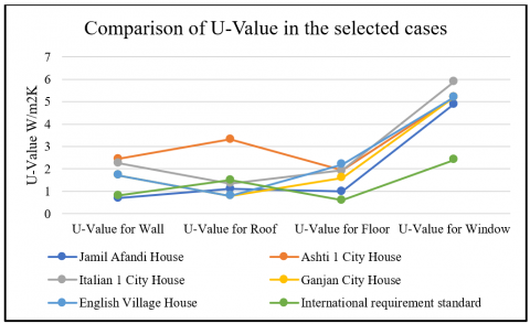 The case studies envelope the building materials' thermo-physical characteristics. The U-value of the external walls, roofs, floors, and windows of the various styles of traditional and modern low-rise houses at ‘Erbil’ was calculated to assess the exterior wall components and to determine whether the buildings could potentially gain or lose heat. This allowed for the prediction of the buildings' energy comfort levels. The comparison between the results and international norms and regulations for the best U-value in houses is shown in Figure 4.