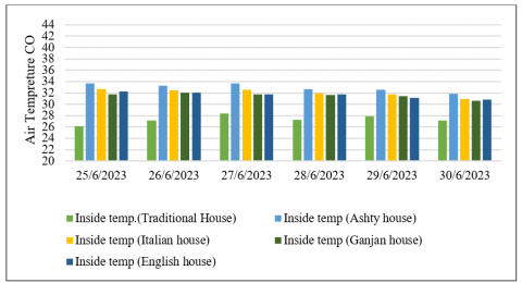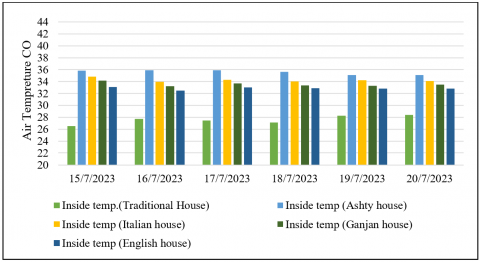 The summer season in Erbil, which runs from June to July 2023, is when the field measurements were collected. Based on the observation, it was discovered that the inside room temperature ranges from 21℃ to 27℃, showing an approximate daily variation of 6℃ only in the conventional house, whereas the outdoor temperature swings between 36.5℃ and 45℃. Modern low-rise dwellings have a daytime variation of around 8℃ in the internal room temperature, which varies between 30.5℃ and 38℃, as illustrated in Figure 7.