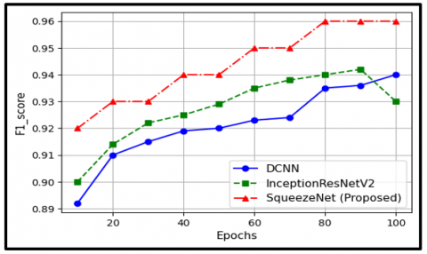 Figure 5 shows the F1-Score which is a harmonic mean of precision and recall, therefore balancing the two metrics. DCNN begins with an F1-Score of 89.2%, rising slowly to reach 94% at the last epoch, thus advancing both precision and recall uniformly. InceptionResNetV2 commences at 90%, rises to peak at 94.2% but has oscillations resulting in it ending at 93%. This indicates its poor ability to maintain balanced precision and recall over time. SqueezeNet opens up with a value of 92% that increases monotonously up to the highest F1-Score value of 96% throughout the epochs. This reflects how well SqueezeNet performs in correctly identifying true positive cases while minimizing false positives during evaluation or learning process.
