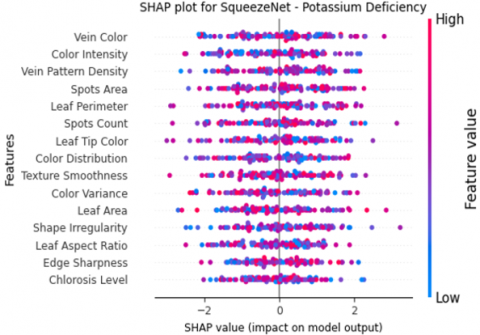 SqueezeNet’s lightweight architecture is meant to give high accuracy by reducing model size and computational cost. In SHAP plots for SqueezeNet, the features ‘Color Intensity’ and ‘Spots Count’ may display large SHAP values, thus indicating their relevance in predicting nutrient deficiencies. This model utilizes feature information efficiently yet retains its predictive accuracy, a trait that makes it ideal for resource-scarce situations like embedded systems or mobile applications. SHAP plots are useful because they show which visual characteristics of rice plant leaves best reveal nutrient deficiencies. The straightforward design of SqueezeNet ensures faster inference without compromising interpretability, hence making it useful in real-time agricultural decision support systems (Figure 9).