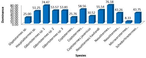 The results of the analysis of the proportion of termite species in all agroforestry land at various altitudes can be seen in Figure 2. Microcerotermes dubius is the species with the lowest proportion, which is 8.33% each, while the highest is Nasutitermes matangensis (76.18%).