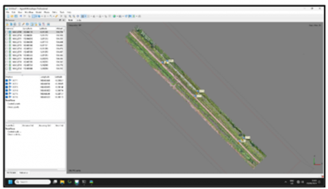 Aerial photos were taken from 08:00 to 12:00 WIT, considering weather conditions. This time was chosen because clouds had not yet formed, and shadows from the sun were visible on large objects. The coordinate system used in road damage mapping is WGS 84 or UTM zone 54S. After the aerial photos were collected, the next step was to process the data using Agisoft Metashape software. The software processes UAV aerial photos into orthophoto mosaics to identify road damage on Waninggap Say Village Road. Orthophotos were created in Agisoft Metashape through stages such as photo import, alignment, optimization, and dense point cloud construction. The resulting 3D models and texture models are shown in Figure 2(a) and DEM (Digital Elevation Model) in the creation of orthophotos. The resulting orthophoto provides high-fidelity data for road condition analysis, as shown in Figure 2(b).