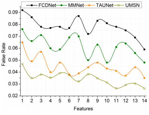 Apart from the experimental analysis discussed above, this section presents the accuracy, precision, false rate, classification, and differentiation error as a comparative study. The number of segments (1 to 11) and features (1 to 14) are varied for verifying the proposed network process across each improvement. For this comparative study, the allied methods considered are FCDNet [28], MMNet [21], and TAUNet [22]. The methods are discussed in the related works session.