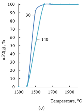 Iron phosphides (Fe3P, Fe2P, FeP2, and FeP) are formed at temperatures above 900℃, and all phosphorous is converted into them at 1,300℃. Following this, at temperatures above 1,400℃, gaseous phosphorus begins to form. The complete transition of phosphorus to the gaseous state occurs at 1,600℃. Thus, gaseous phosphorus is formed in the system through iron phosphides following the scheme: Ca3(PO4)2→iron phosphides→P2.
