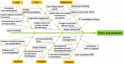 To understand the root cause of the problem of low productivity, the Ishikawa Diagram presented in the research [9] was taken as an instrument, as seen in Figure 1, which allowed the possible causes of over-excavation to be broken down into key categories as Drilling Method, Selection of Explosives, Geological Conditions, Operating Procedures.