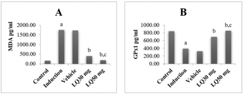 Figure 1. Effects of LQ on renal functions and RML biomarkers (a) significantly different compared with the control group; (b) significantly different compared with the induction group