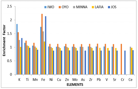 An enrichment factor analysis was performed on an Abuja sample to distinguish between anthropogenic and natural sources. This graph depicts the degree of enrichment of a particular element concerning its relative abundance in the Earth's crust [27, 56]. The reference element used by the study [26] is Ca, which is thought to be of crustal origin. The enrichment factor is defined as follows: