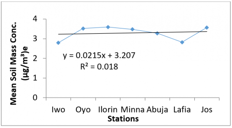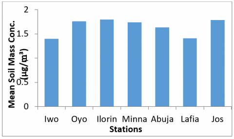 The results show that quartz is the most prevalent mineral constituent in the samples collected from all of the stations studied. This demonstrates that the harmattan that blows across Nigeria contains a high concentration of quartz minerals, which could be due to dust from the Sahara Desert. Other minerals, however, are present in trace amounts or small amounts, as shown in Table 3. These findings are consistent with those found in Ile-Ife [4] and Ilorin [2], with the exception that mica, halloysite, kaolinite, and microcline were not found in Iwo, Oyo, Ilorin, Minna, Abuja, Lafia, and Jos.