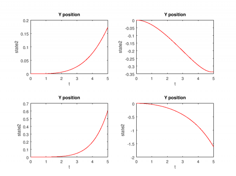 Figure 10 gives the second state, the y position of the robot. Each graph of state2 function is associated to a given initial condition. Since we have 4 initial conditions then we have 4 state2 computational simulations.