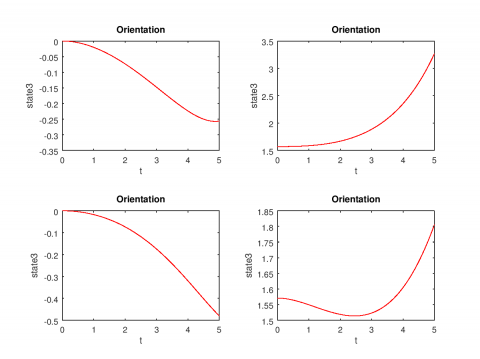 Figure 11 gives the third state, the heading angle of the robot. Each graph of state3 function is associated to a given initial condition. Since we have 4 initial conditions then we have 4 state3 computational simulations.