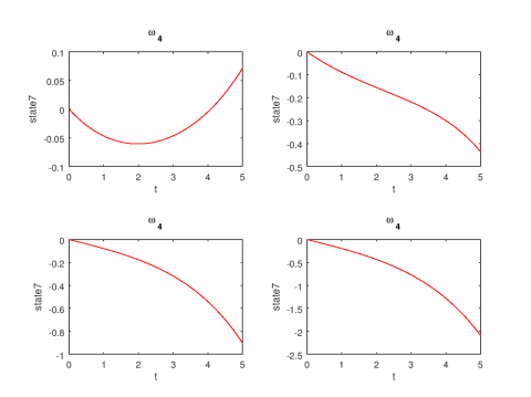 Figure 15 gives the seventh state of the robot. Such a state function represents the angular velocity of Wheel4. Each graph of state7 function is associated to a given initial condition. Since we have 4 initial conditions then we have 4 state7 computational simulations. The plots all the seven feasible states in the same coordinate systems, where each coordinate system is associated to an initial condition is the following.