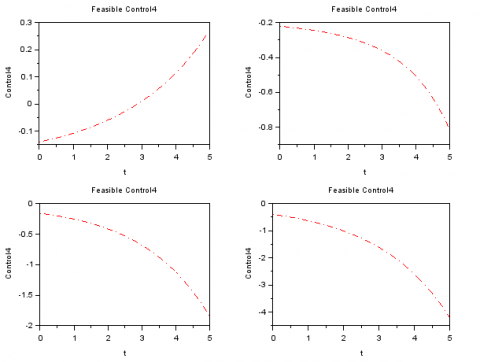 Figure 6 gives the controls4 defined by u4(t). u4(t) regulates the angular velocity ω4(t) of wheel4. Each u4(t) is associated to a given initial condition. Since we have 4 initial conditions then we have 4 computational simulations for u4(t). u1(t), u2(t), u3(t) and u4(t) are the feasible controls that regulate respectively the angular velocities ω1(t), ω2(t), ω3(t) and ω4(t) of the four wheels.