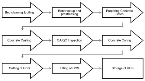As shown by the process flow chart in Figure 2, it can be seen that the process started with bed cleaning and oiling. The process continued with the rebar arrangements and prestressing of the prestressed steel before concreting and casting commences. After the QA or QC inspection passed with an approval stamp, the precast HCS was cured until targeted strength of the concrete was achieved and later finalized with the segmentation and storage.