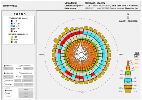 The site location is in Samawah, Iraq. The weather is very hot, dry, and dusty, and its climate zone is categorized as being in the 1B class according to ASHRAE [4]. The weather data was imported to IES VE software from EPW [20], and then Climate Consultant 6.0 software was used to present the dry bulb temperature X relative humidity as Figure 1(a), monthly diurnal averages as Figure 1(b), which show the global horizontal, direct, and diffuse radiation (Wh/s.q.m) with average dry bulb and wet bulb temperature, and finally the wind velocity and directions illustrated in Figure 1(c).