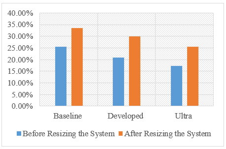 The highest energy savings were achieved in the baseline model, while the lowest system sizing cut was in the baseline (as shown in Table 2). Figure 8 shows that resizing the system contributes to about 30% more overall energy savings compared to the energy savings without resizing in the baseline. While in the developed and ultra-models, resizing the system contributes to about 40% more overall energy savings in comparison with the energy savings before resizing.