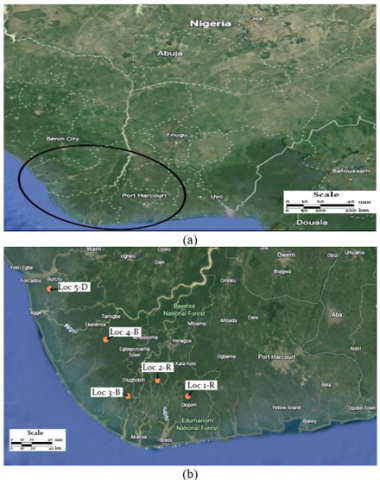 Figure 1. Case study area location (a) Nigeria's Niger Delta, (b) Data locations