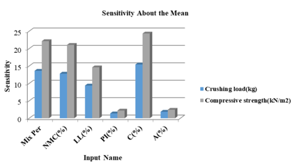 Finally, sensitivity analyses are established to investigate the impact of the input parameters on the crashing load and compressive strength, showing that the clay content (C) has the most impact on both outputs, followed by the nanomaterial-to-water ratio (Mix per.), NMC, and LL.