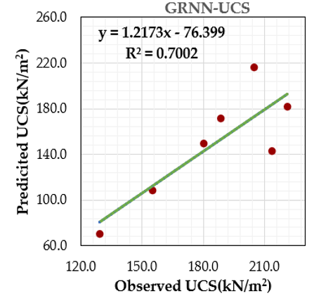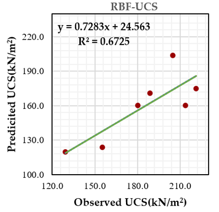 To this end, three AI models have been adopted to predict the crashing load (q) and UCS of active soil stabilized with nanomaterials, a topic with limited yet growing research interest. These models encompass the multilayer perceptron (MLP) neural network, generalized regression neural network (GRNN), and radial basis function neural network (RBF), and their performance has been evaluated using a variety of statical matrices and plots. Finally, sensitivity analysis was conducted to select the parameter(s) that impact the crushing load and compressive strength the most.