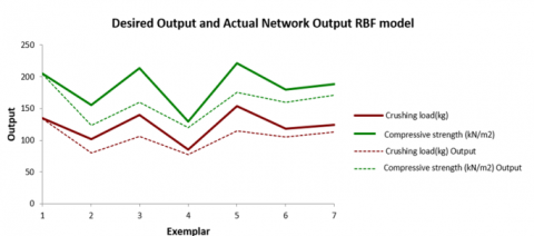 Figure 6. Comparison between actual and predicted for both the crushing load and compressive strength values (a) MLP, (b) GRNN, and (c) RBF