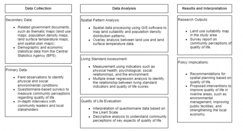Therefore, this study not only provides an important contribution to the local context in addressing riverside settlement issues, but also enriches the global dialogue on sustainable urban planning strategies. Through an innovative methodological approach, this study proposes a new perspective on the dynamics between spatial planning, standard of living, and quality of life, as well as the implications of these findings in formulating more effective and inclusive urban policies.