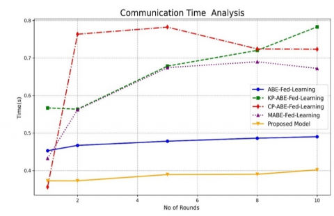 where, Tsend is the time for transmitting the data from devices to server whereas Taggregate is the time taken by the server/cloud for aggregation process. N represents the number of rounds. For this experimentation, different existing Communication time for ABE techniques with FL models and proposed ABE-HCL integrated in FL process are considered.