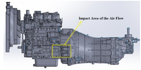 Real dimensions and structural constraints of the front compartment were respected to ensure physical compatibility and to avoid interference with other components. The region where the airflow impacts the engine surface is shown below, as defined in Figure 2.