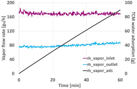 where, vapor_inlet andvapor_outlet are the inlet and outlet vapor mass flow rates, respectively, and vapor_ads is the mass flow rate of the adsorbed vapor, all expressed in gv/h.