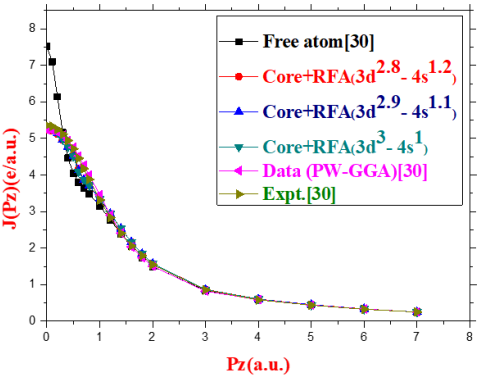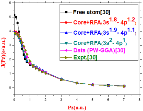 Compton scattering is an experimental capability that can be employed to explore the electron momentum distribution in matter, and through CS, the chemical character can be correlated with the electronic structure via the electron momentum density n(p). Compton profile (CP) J(pz) is one-dimensional quantity—and is the projection of the three-dimensional momentum density n(p) onto the scattering vector (parallel to pz). Mathematical approach states that the momentum density n(p) is "smoothed" along the directions orthogonal to pz, and n(pz) = n(p,φ) with polar coordination [7-25].