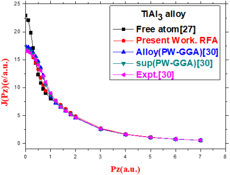 Figure 5 displayed the shape of the Compton Profile for both the theoretical calculations and the practical measurements for the alloy (TiAl3). The ratio of the alloy (TiAl3) shows that the ratio of Al is three times that of Ti. All theoretical calculations and practical measurements [30] of the shape of the Compton Profile (JPz) were performed using (a.u.) unit for the momentum region between (0→7 a.u.).