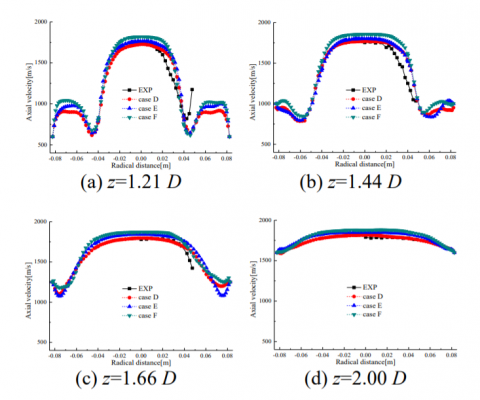 To understand the details of the flow field, Figures 6 and 7 shows the LES profiles of the mean axial velocity in four different axial locations of the mid-plane in both non-reacting and reacting flows for all cases examined. It is clear that the expansion of the annular swirling jet forms two symmetrical peak velocities that decrease with the increasing of the axial distance due to the diminishing of the jet inside the combustion chamber. However, the distance between the peak points is the opposite due to the expansion of the main flow. It is clear that the maximum value of the axial velocity is relatively higher in the reacting flow. At z/D= 1.21, for example, the maximum values of axial velocity increase from 40 m/s in case B (non-reacting flow) to 45 m/s in case E (reacting flow) under the same Reynold number of 118 000. The regions with zero axial velocity is usually defined as the boundary of the recirculation zones [24]. Consequently, it is easy to compare the location and structure of recirculation zones through the profiles of the average axial velocity. It is clear that the length of CTRZ is much longer than that of ORZ which disappears when the axial distance is further than 2.00 D. Furthermore, the magnitude of the recirculation zone and the reverse velocity increase with an increase in the Reynold number in both non-reacting and reacting flows. At z/D= 1.21, for example, the breadth of CTRZ increases from 0.04 m in case A (Re= 85 000) to 0.045 m in case C (Re = 118 000).