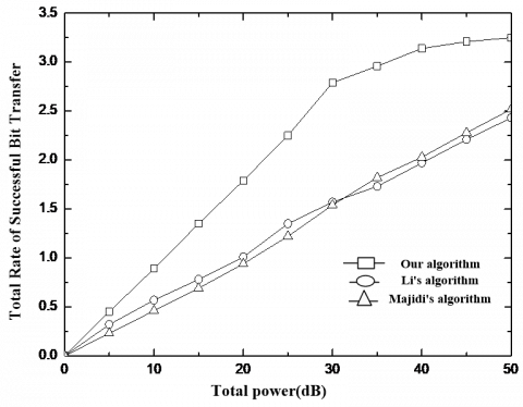 As shown in Figure 2, the total successful bit transfer rates exhibited a gradual growth with the increase of the total power. Our algorithm enjoyed the largest growth amplitude. When the total power reached 30 dB, the growth rate of our algorithm started to slow down but stayed above 2.5 kbps/s, and eventually reached 3.5 kps/s, while the contrastive algorithms failed to surpass 2.5 kbps/s. The comparison shows that the total successful bit transfer rate, as well as the data transfer rate, of the proposed algorithm is faster than that of the other two algorithms.