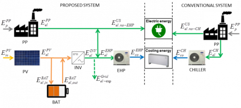 In order to satisfy space heating and cooling demand of the office a PV system, equipped with an electric storage, interacting with a reversible EHP is here considered as proposed system (PS). This system is based on a PV plant, located on the flat roof of the building, an inverter (INV), an electric storage (BAT) and a reversible EHP. The PV system can satisfy both electric requirements of the EHP and the end user (PCs, printers, lights, etc.). The system interacts in bidirectional way with the external grid and the electric battery.