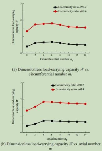 Then, the author examines how the number, area ratio and maximum depth of the dimples affect lubrication performance when cylindrical dimples are textured on the surface of bearing pad 3. Figure 5 records the variation in dimensionless load-carrying capacity W with the circumferential number m3 and the axial number n3 of the dimples. It can be seen that the dimensionless load-carrying capacity W increases firstly and then decreases as the circumferential number m3 and the axial number n3 of the dimples keep growing. The maximum value of W appears when the circumferential number m3 is 6 and the axial number n3 is 4.