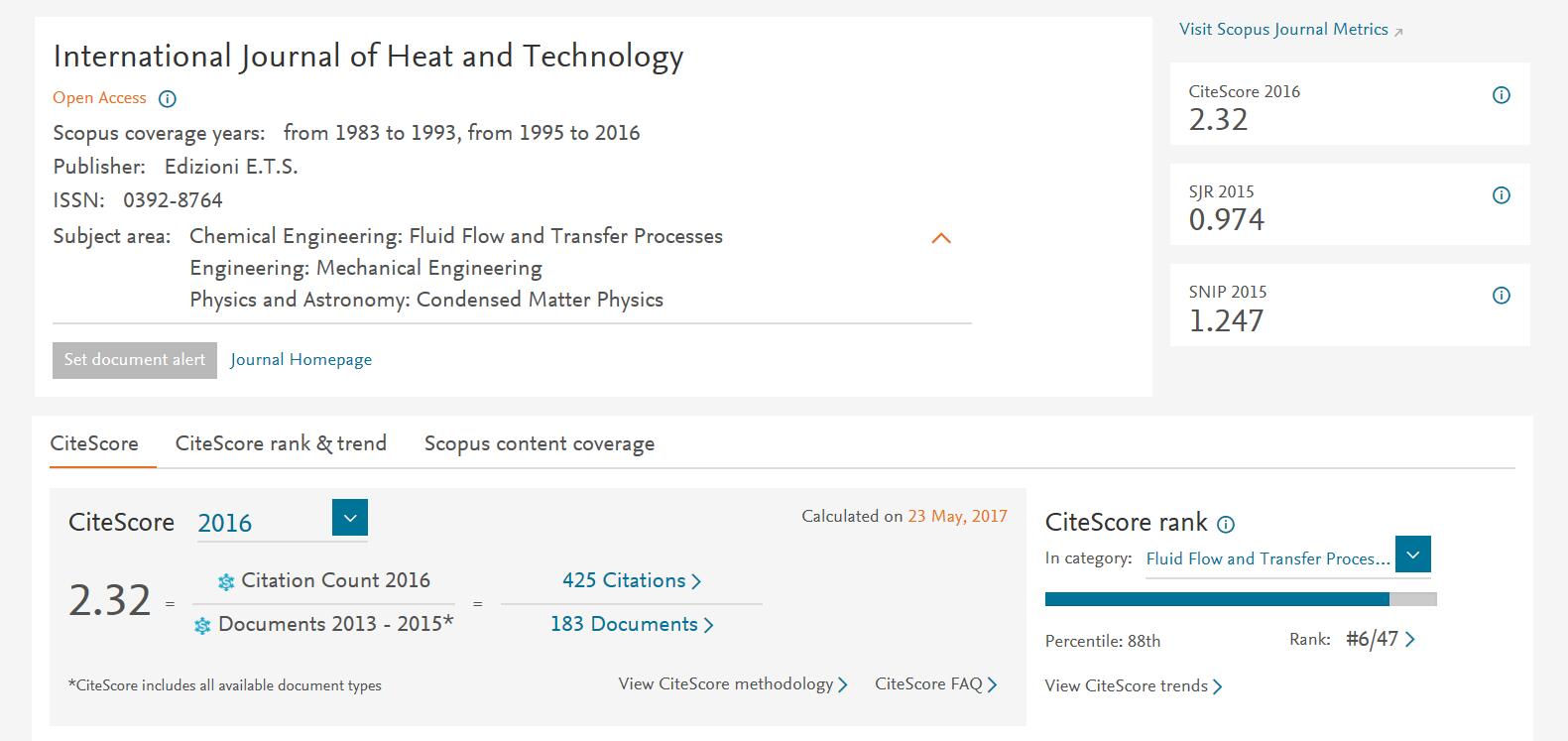 International Journal of Heat and Technology(IJHT) is now listed on CiteScore with a ranking of 2.32 as of 2016. The advantages with recent changes to CiteScore are that it provides a more timely, comprehensive, and transparent display of articles indexed by Scopus. CiteScore provides a more clear view of a journal’s impact factor than previous metrics used.