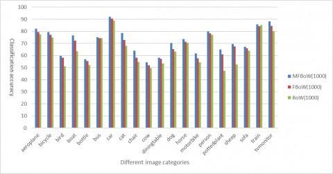 Further, the following three tables respectively list the mean classification effects of the three models. It can be seen that, the MFBoW surpassed the FBoW by 3.12 %, 3.92 % and 4.11 % in mean classification accuracy, when the codebook size was 1,000, 5,000 and 7,000, respectively. In addition, the standard deviation of the MFBoW was always smaller than that of the FBoW and that of the BoW, whichever the codebook size. To sum up, our method can achieve better effect than the other two models in image classification.