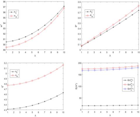 Comparatively, the producer’s green cost $θ^*$ is the only parameter that increased marked with the growing λ, while the other decision variables and expected profits were not significantly changed. This means the environment can be greatly improved if the consumer has a high environmental awareness. Thus, we should conduct green marketing to boost the consumer’s awareness of environmental protection.