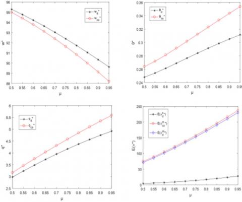 Thirdly, the author investigated the effects of the mean of stochastic output ratio on the optimal decisions and expected profits of the green SC and its parties. With μ being the only variable, the change curves of the optimal decisions and expected profits with the changing mean of stochastic output ratio ε are shown in Figure 3.