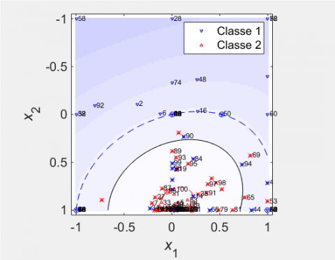 We remark that the number of error vectors is large in Figure 3 = 42, as well as the margin increases, so the performance decreases = 58 %, even Figure 4, the performance is almost equal to 59 %, it is the same for the 1st training batch. If we look at the third case (Figure 5), we find that the number of error vectors is 17, the margin is small, the performance is not better (68 %). So the best case is the third, we observe the number of errors equal to 32 % that is to say we agreed to have misclassified points.