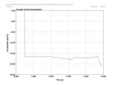 The braking analysis is fundamental to evaluate the performance of a F1 car. In this phase, the car passes from the maximum speed calculated in the previous section (365 km/h) to full stop. The braking in most cases precedes the entry of the car in a curve; in this situation, it is necessary to have a lot of downforce, in order to have the maximum possible grip between tires and asphalt, to minimize space and the braking time.