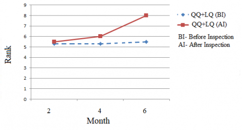The process control can be analysed through rank- month plot for the sum of QQ and QL before and after inspection in different months. The process is said to be in control if the deviation from the before and after (QQ + QL) is within $6 \sigma$ limit (Based on the design requirement). The rank- month plot is shown in the Figure 20.