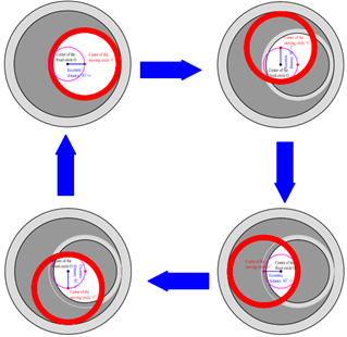 According to the kinematics theory, the planar planetary motions of the rotor and stator of the PDM can be regarded as the relative pure rolling of the two instantaneous circles. Hence, the rolling-in method (Figure 7) was adopted to analyze these motions [20].