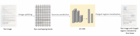 The idea is to identify the scanner at the origin of a questioned image, divide it into non-overlapping blocks and then to find blocks that are predicted to be scanned with a different scanner. These incorrectly identified blocks, marked by bounding blue boxes, indicates suspicious copied area. The proposed forgery detection scheme is illustrated in Figure 12.