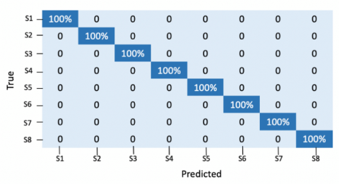Then, after demonstrating the good performance of our scheme only on a single block, we evaluated the entire pipeline, i.e., CNN along with majority voting based on the decisions obtained from all image blocks. The confusion matrix presented in Figure 4 for classifying full images has an average classification accuracy of 100% using the same dataset which is expected as the majority voting mechanism used in our system would definitely increase the accuracy.