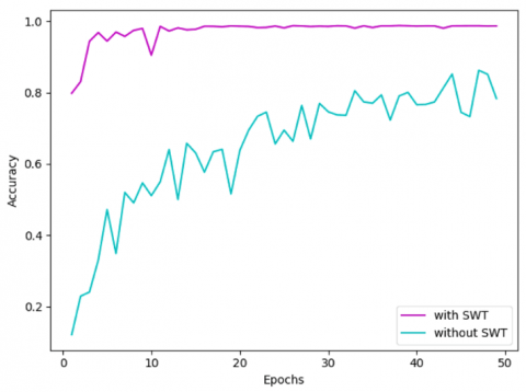 The block size is one of the most important parameters of our proposal with an impact on its classification accuracy. Thus, another experiment was carried out in order to show the effect of the block size. Experiments were carried for both DWT and SWT for 2 different block sizes. In Figure 10, we observe the effect of the wavelet transform and the number of samples used for training on the performance of the designed CNN. For the SWT 128 (see Figure 10), our model shows a relatively steady trend, whereas the other models show that the accuracy gradually increases with the increment of the number of training images. This demonstrates that the performance of our model is independent of the size of the training data, whereas an optimum number of training samples has to be selected for other models to attain a high accuracy.